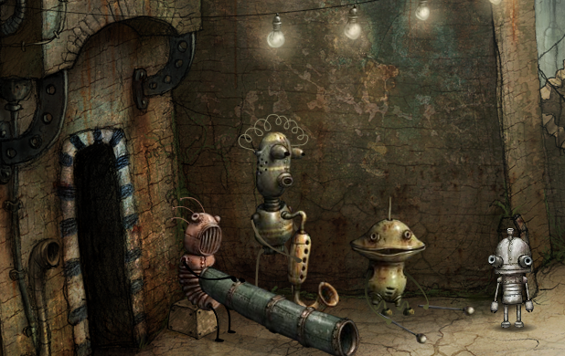 So Machinarium is goddamn gorgeous. It’s quite a good game, too — loads of character, solid, reasonable puzzles, great music (particularly the tune when you get the guys pictured here their instruments back). Better game reviewers than myself have written reviews already, so I’ll just point you to one of those. But seriously, if you’re into adventure games, you owe it to yourself to play this. Every single person who’s been reading this blog this month because of the IF Comp should be buying this game right now.