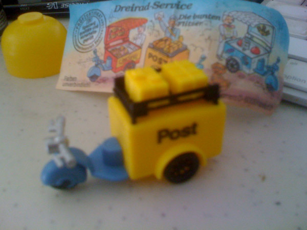 Man, this is rough. I feel like I’m not fufilling my goals with this project if I don’t come up with a funny or interesting bit of fiction or commentary or something for at least nine out of ten of these things. But look at this, it’s a little mail-delivery scooter. What can I say? This would be an even worse toy than the cement-moving truck, if it didn’t have the little removable packages on the top. And it had stickers to put on, that’s pretty cool.